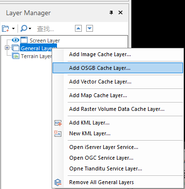 2 Layer Manager>General Layers>Add OSGB Cache Layer, select the *.scp configuration file generated.