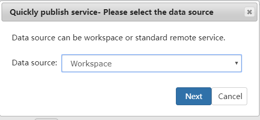 6 In the Quickly publish service--Select datasource page, select the Workspace as the Data source, and click Next.